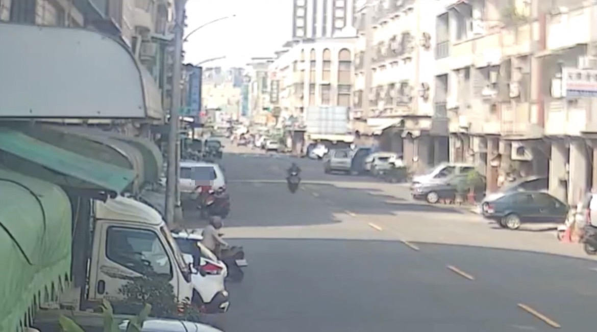 騎乘機車的婦人搬走水冷氣機。(高雄市鳳山警分局提供)