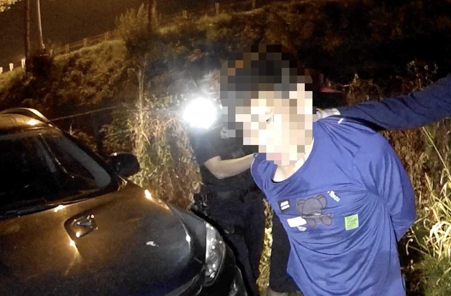 (記者吳冠賢報導)高雄市鼓山區警組在今(28)日凌晨1時45許,在博愛路與明華路口發現一輛藍色自小客車行駛未開啟大燈,遂上前盤查。不料該車拒檢逃逸,警方立即尾隨該逃逸自小客車並通報攔截圍捕,該輛自小客車逃逸期間在海功東路與翠華路口衝撞警車,造成警車右側車身車受損。最終在燕巢區一帶的產業道路,為警網攔下,警方見機立即上前破窗壓制駕駛及乘客,全案除依公共危險及妨礙公務罪嫌辦外,另依道路交通管理處罰條例舉發15項違規。