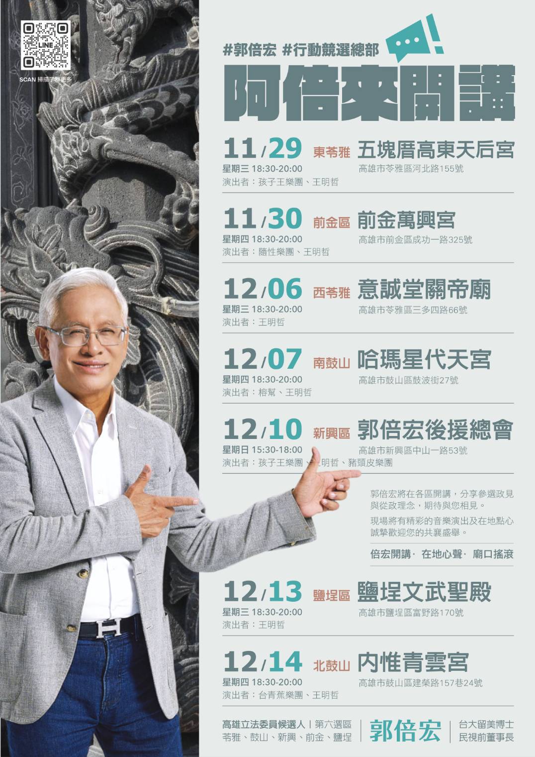 為了深化與地方民眾的溝通以及理念傳播,高雄第六選區立法委員候選人郭倍宏,將從今天(11/29)晚上18:30起,連續三週共舉辦七場「阿倍來開講」系列活動,地點遍佈東苓雅、西苓雅、新興區、前金區、鹽埕區、南鼓山和北鼓山。郭倍宏將在五塊厝高東天后宮、前金萬興宮、意誠堂關帝廟、哈瑪星代天宮、鹽埕文武聖殿、內惟青雲宮等地方重要信仰中心開講,並在12月10日「世界人權日」這一天下午15:30,回到高雄美麗島雜誌社舊址(中山一路與大同一路交會口)、即郭倍宏後援總會所在地,舉辦民主與人權紀念活動。