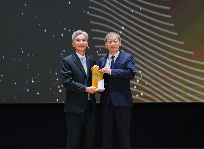 中鋼王錫欽總經理(右)接受環境部薛富盛部長(左)頒發「資源循環績優企業」最高榮譽金質獎。(中鋼提供)
