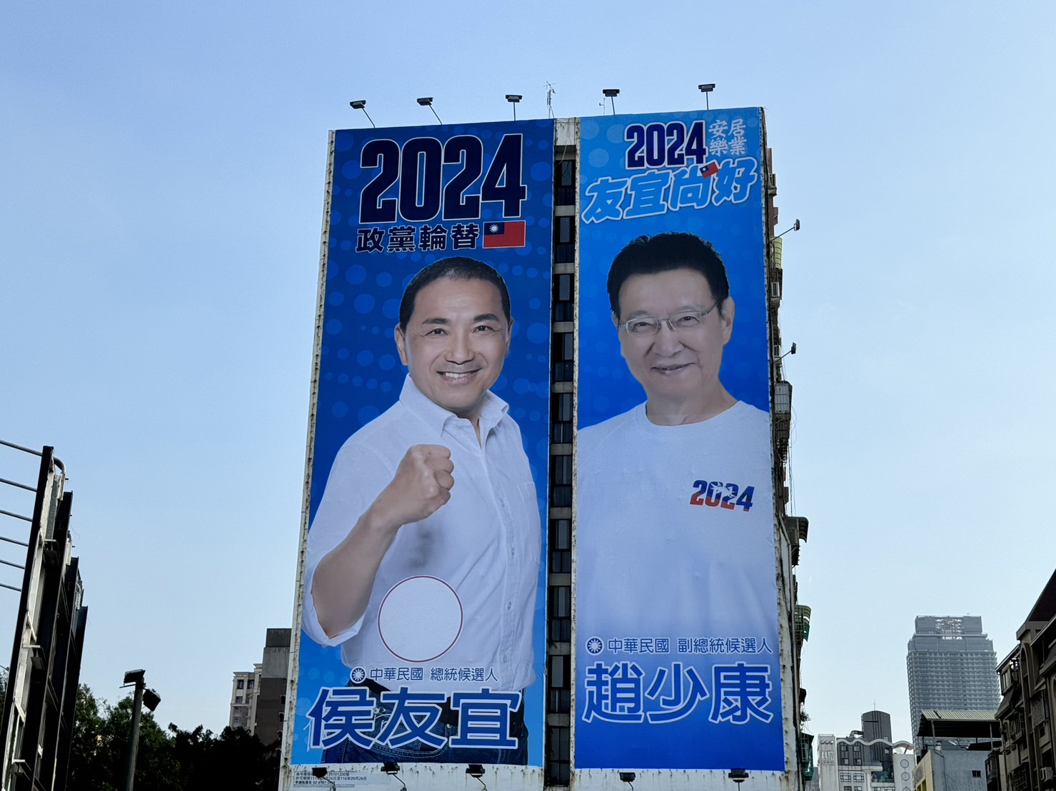 (記者謝富益報導)國民黨正副總統候選人侯友宜、趙少康,高雄首面大型看板今正式上架,該面看板佇立於中山與五福路口,人來人往的新崛江商圈車流量龐大、站在中山路往小港方向看,一眼望去遠遠就能看見兩個人的巨型看板相當吸睛。該塊看板本來由郭台銘承租懸掛總統連署廣告,郭台銘宣佈不登記後廣告悄悄撤下,令外界相當好奇將由誰掛上,答案揭曉正是國民黨正副總統候選人侯友宜、趙少康。