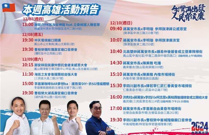 國民黨高雄市黨部表示,本週特別邀請到最帥男神台北市長蔣萬安為我們高雄的立委候選人輔選站台,週日上午到旗津與第八選區李明璇合體參拜當地廟宇,之後前往鳳山參加第七選區鍾易仲後援會成立並進行車隊掃街,下午與第六選區陳美雅一起吃播然後前往內惟市場掃街,再到三民區參加第五選區黃柏霖後援會成立,最後一站則是到左營區自由黃昏市場與第三選區李眉蓁一起掃街拜票。