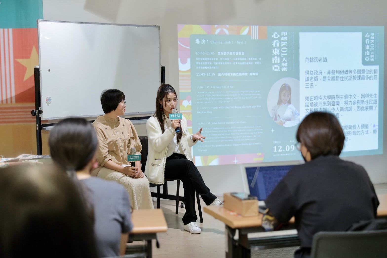 上午范懿筑老師分享她在台灣投入越南語教學工作的契機,是因為政府推動新南向政策進入學校教學,後來因為新冠疫情,開始投入心思製作影片上傳至社群平台,她也即時與現場民眾教學互動,生動活潑的表達方式,馬上引起大家對學習越南語的興趣。下午由Aman帶領大家製作印尼水果沙拉(Rujak buah),他表示剛開始製作影片時其實很怕老闆看到,但因為影片內容十分有趣,後來老闆居然成為他的忠實粉絲。Fathin表示因為自己很喜歡旅遊,但穆斯林在台灣旅遊其實有一些不方便,所以想要透過製作影片分享推廣台灣好吃好玩的地方,降低目前許多公共設施的語言標示不足的障礙,或是整理熱門景點中的清真飲食,有許多穆斯林朋友因此十分感謝她。