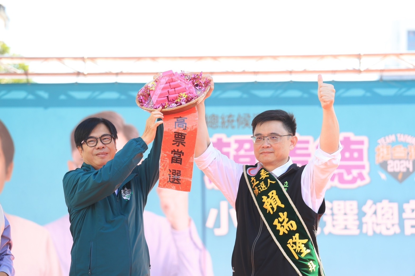 總統候選人賴清德、副總統候選人蕭美琴分別授贈雙賴戰旗及戰貓徽章,預祝賴瑞隆能夠順利高票連任,也呼籲鄉親支持會做事好立委賴瑞隆,讓賴瑞隆和清德、蕭美琴、陳其邁,繼續為台灣、為高雄共同打拼。金曲歌王蔡小虎也一連以歌相挺賴瑞隆,並獻上親筆成功一定是我們的,祝賀賴瑞隆能夠最高票當選。