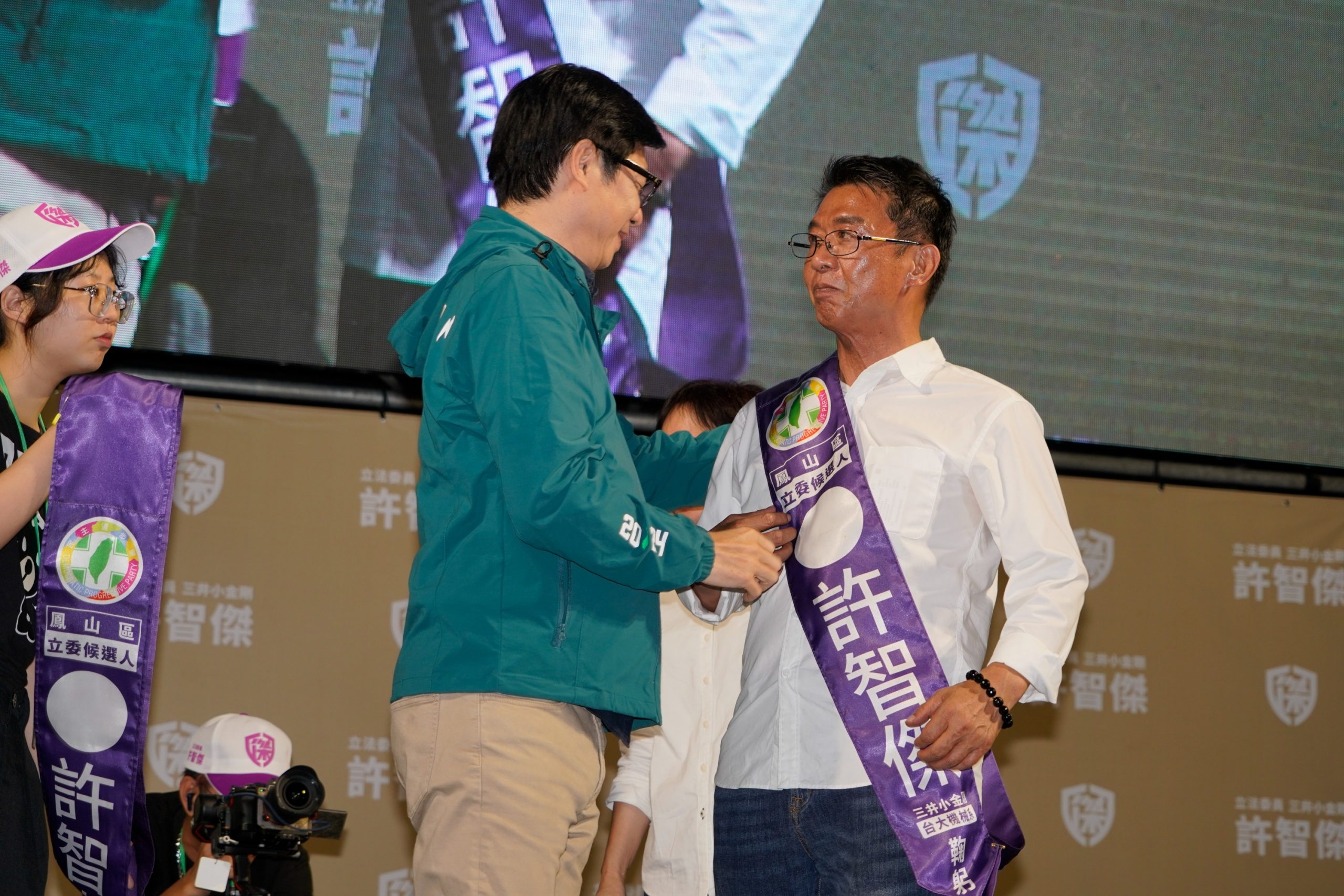 高雄鳳山區現任民進黨籍立委許智傑競選總部成立,聚集超過6千名鳳山市民湧入五甲龍成宮,不僅民進黨總統候選人賴清德、立法院長游錫堃、行政院副院長鄭文燦、高雄市長陳其邁皆到場為許智傑站。(立委許智傑競選總部提供)