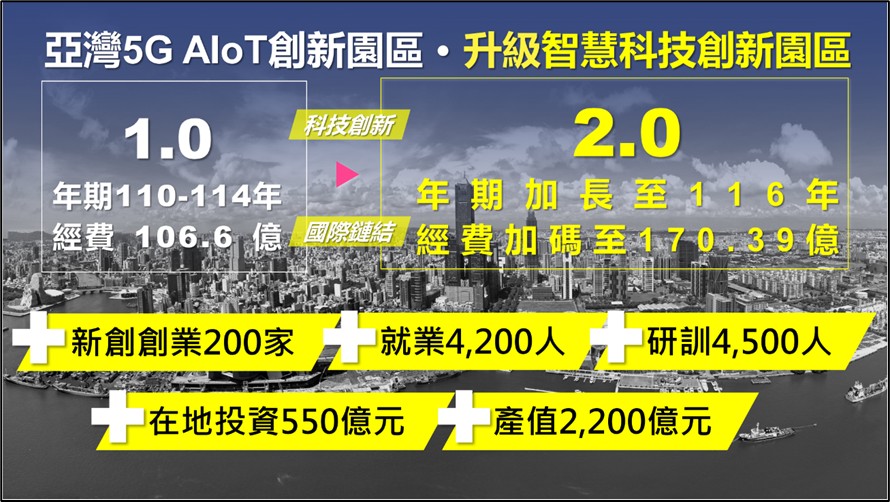 經發局表示,「亞灣5G AIoT創新園區」(亞灣1.0)吸引超過130家廠商共同進駐,創造超過327億產值等顯著成效,行政院今年5月核定升級為亞灣2.0智慧科技創新園區推動方案,亦於今年8月中旬啟動聯合招商及聯合服務單一窗口,整體計畫預計投入170億元,期程延長至7年。依經濟部預估吸引產業投資550億元,帶動超過4,200個就業機會。
