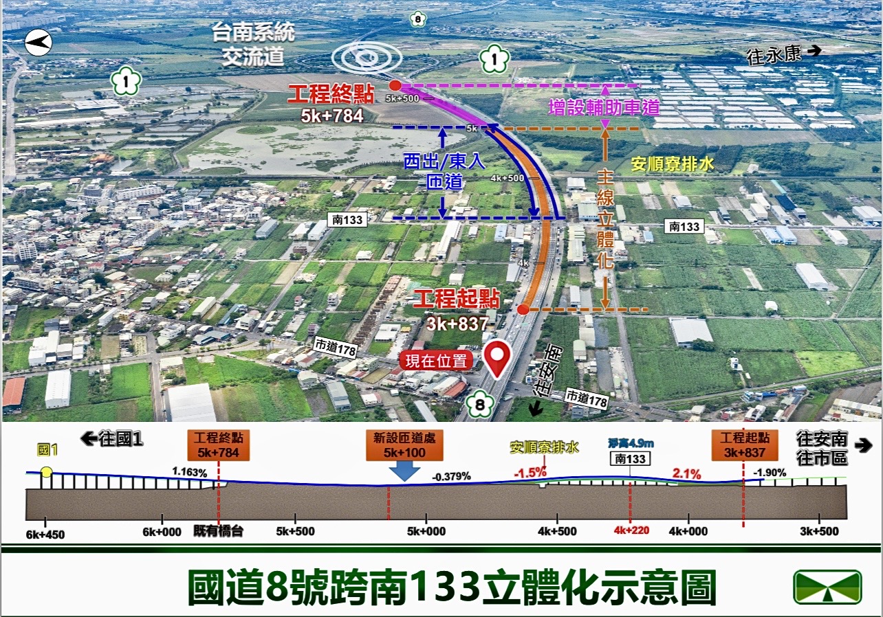 工務局指出,由於國道8號與南133線平交路口造成主線車流延滯回堵及衍生交通意外事故等問題產生,因此,經南市府提報相關可行性研究報告後,並經行政院於111年5月20日核定通過,由交通部高速公路局接續辦理規劃及建設計畫事宜,另於112年10月核定後續的建設計畫,而目前全案進度由交通部高速公路局辦理設計作業中,預計將於114年完成設計與開工、119年完工,此外,南市府配合計畫將進行連絡道拓寬工程作業,預計於114年開工、115年完工。