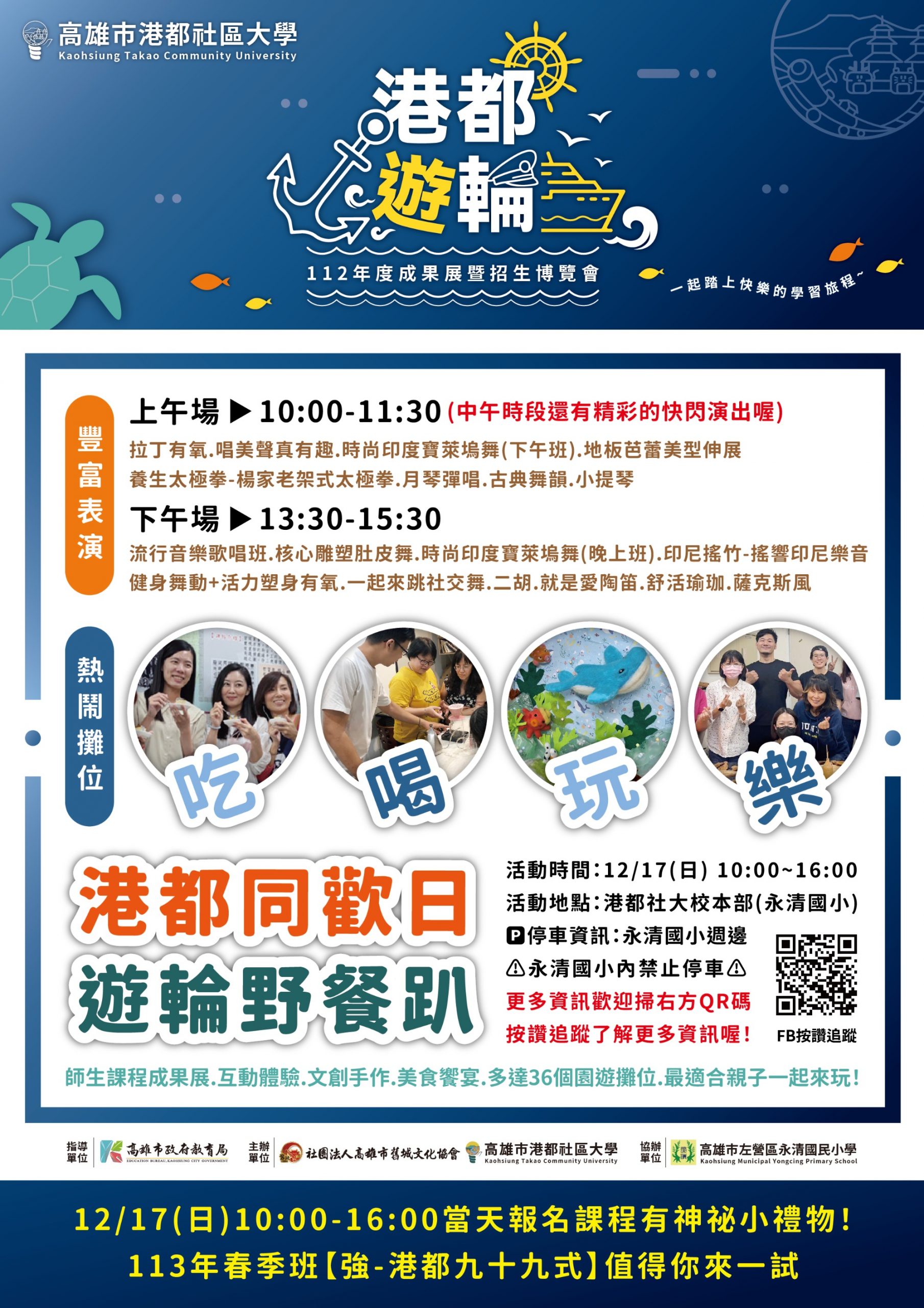 高雄市港都社區大學校長梁淑貞表示,每項演出、攤位,都是師生們的傑作以及經過多次排練的結果,我們希望透過這樣的展演平台,讓教師和學員都能更有自信,成為更強大的自己;當天也是明年春季班的招生開始,歡迎闔家蒞臨「港都遊輪野餐趴」同歡。