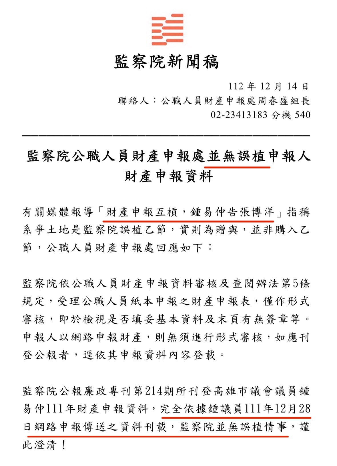 張博洋指出,鍾易仲聲稱名下土地是「繼承、贈與」,還開記者會謊稱是監察院網站出狀況讓他的資料變成「買賣」,才遭人誤會。但監察院12/14已發新聞稿表示:「完全依據鍾議員111年12月28日網路申報傳送之資料刊載,並無誤植」,等同鍾易仲說謊被打臉。