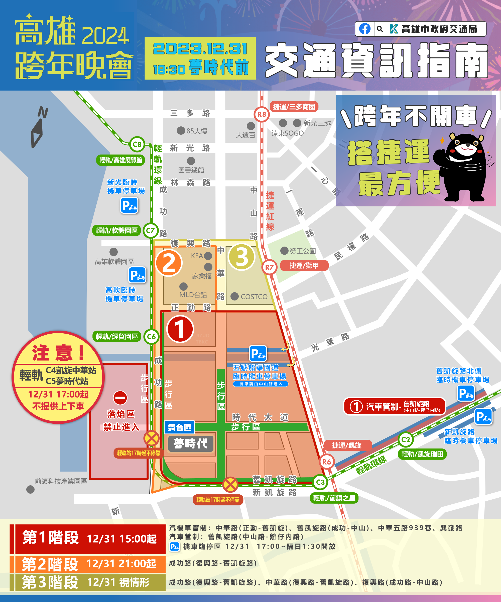 (記者林韋呈報導)「2024高雄跨年晚會」今年持續在時代大道舉行,市府規劃多項交通管制及疏運措施,包含夢時代周邊道路將實施三階段交通管制;捷運與輕軌加密班次,人潮熱區兩輕軌站(C4-凱旋中華站、C5-夢時代站)配合人流管制,當日17點起不停靠。散場時捷運延長營運至凌晨2時、輕軌延長營運至凌晨1時30分,台鐵將加開5班列車疏運,請市民朋友多加利用。