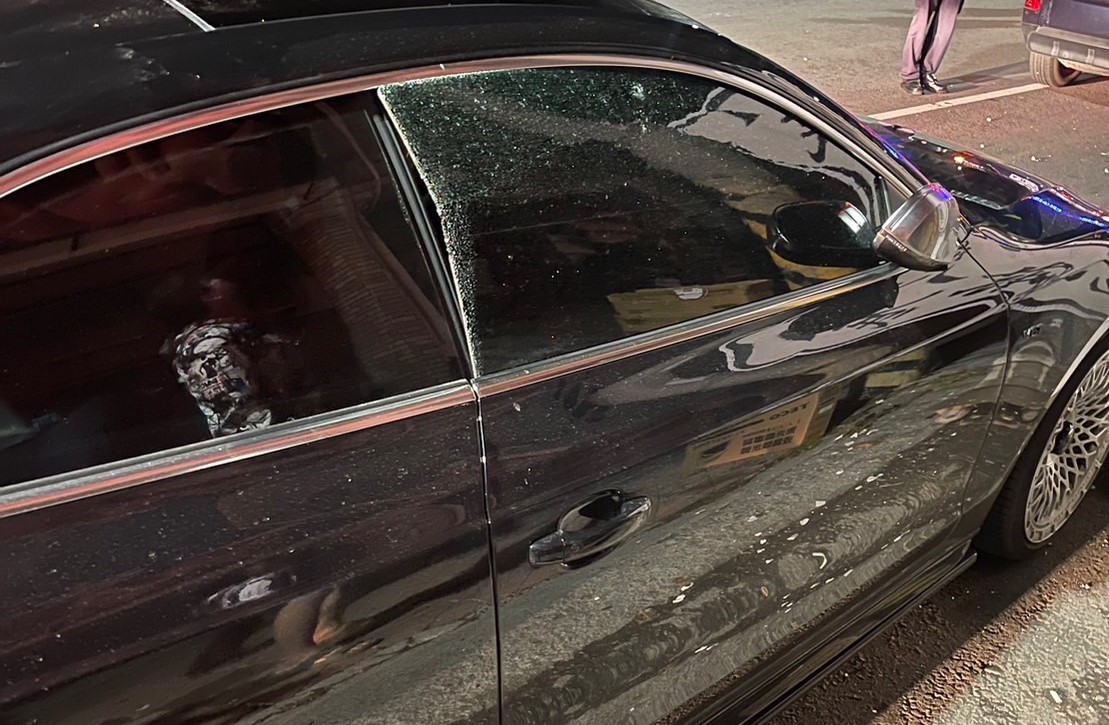 台電變電箱故障,碎片掉落使停在路邊自小客車受損。(高雄市楠梓警分局提供)