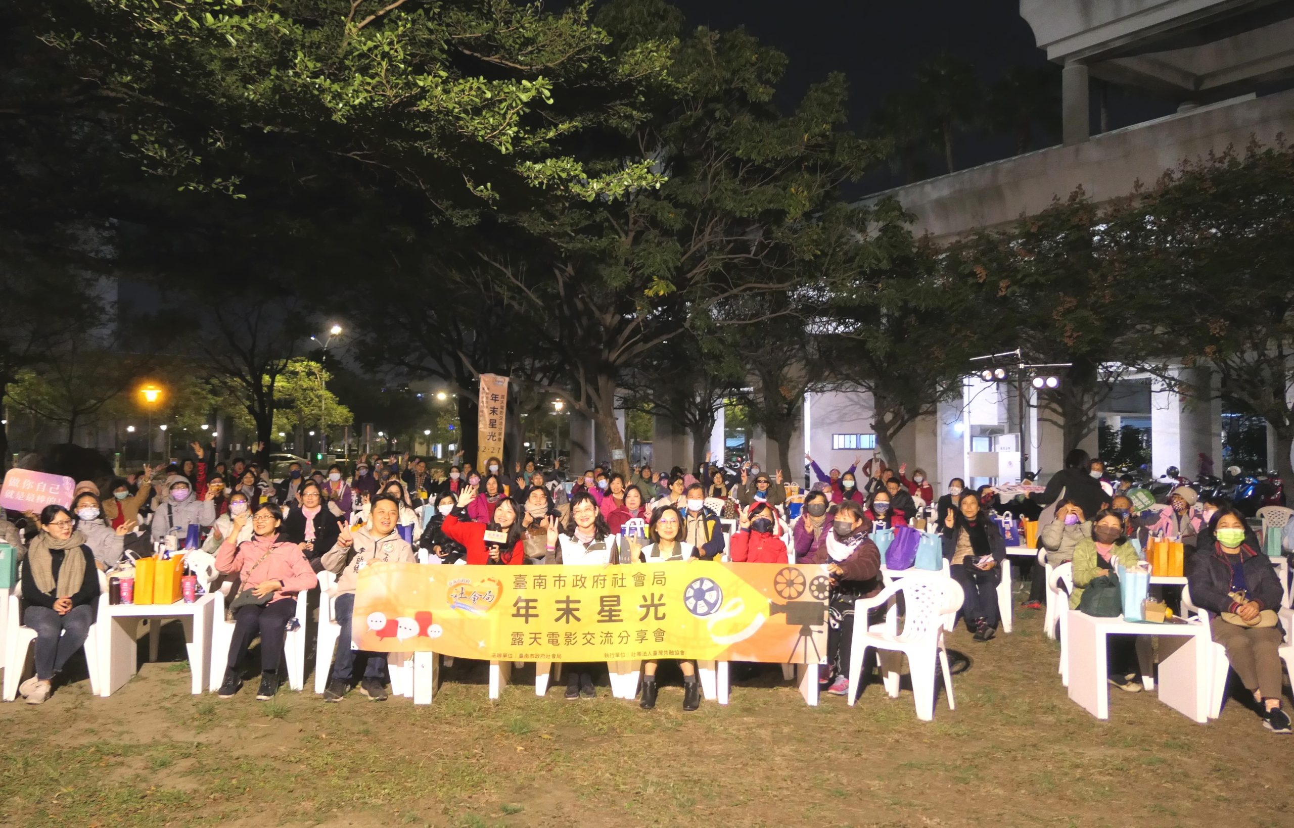 臺南市政府社會局於27日晚上在臺南市社會福利綜合大樓戶外草地開辦「年末星光」露天電影院。(臺南市政府社會局提供)