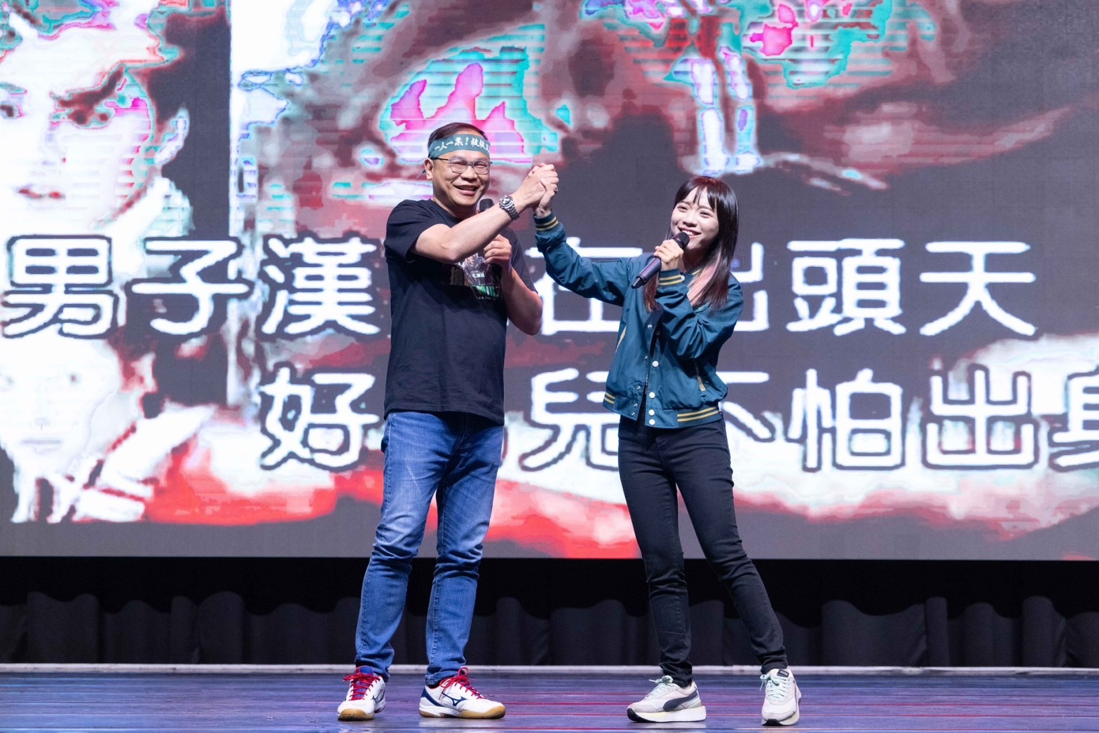 立委民進黨候選人黃捷出席「搶救王義川」高雄場,兩人除了為民進黨拉票外,更手牽手合唱「飛龍在天」,炒熱現場氣氛。(黃捷競總提供)