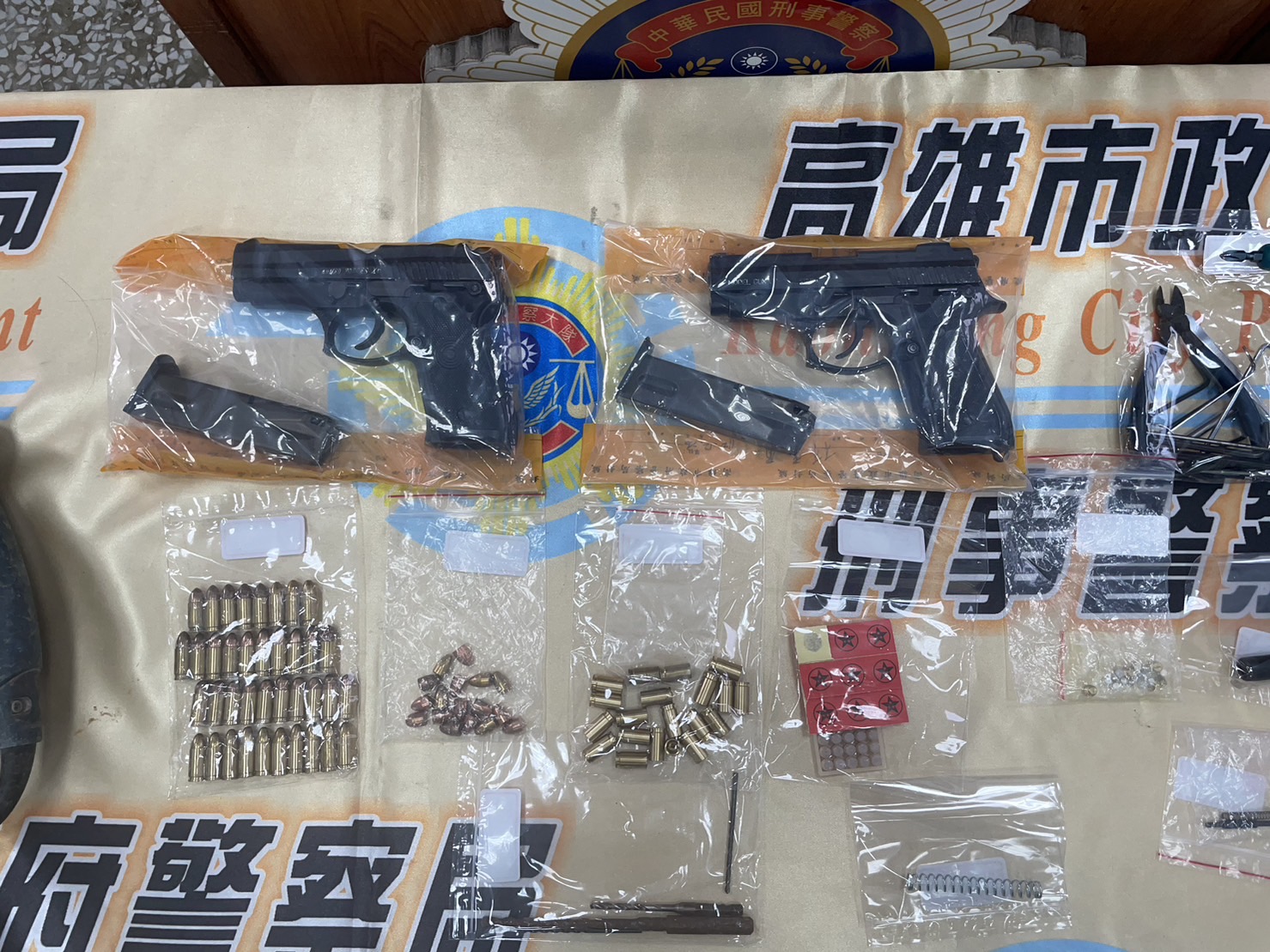 手槍2支、子彈38發、槍管1支、槍枝零組件1批、改槍工具1批、子彈半成品1批、子彈底火等證物。(高雄市政府警察局刑事警察大隊提供)