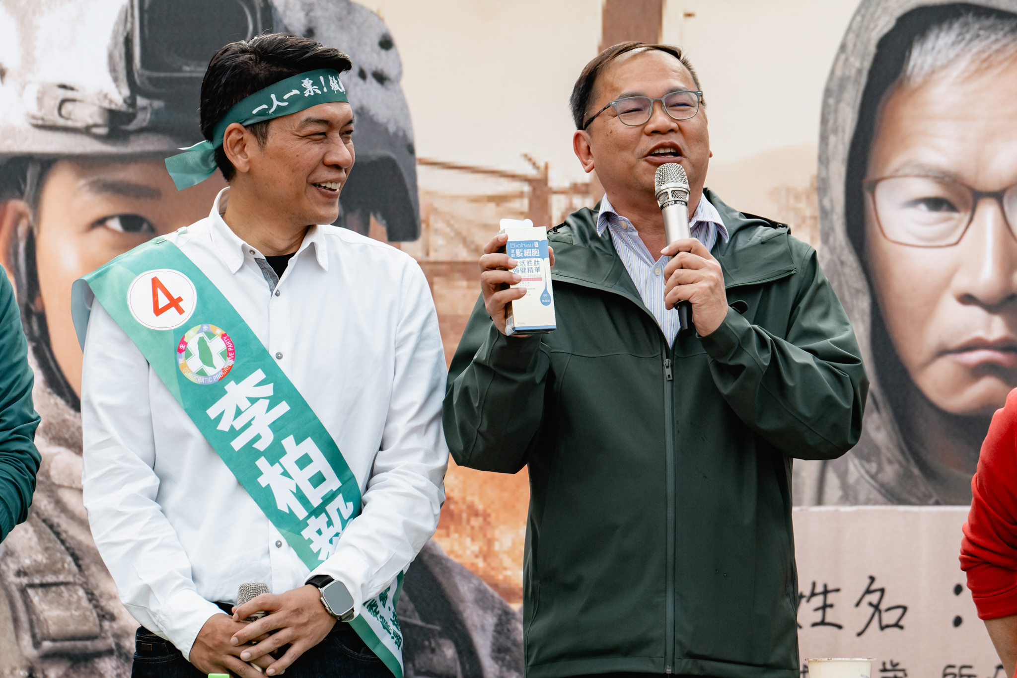 現場李柏毅送上生髮水給王義川,希望可以照顧他過度操勞的頭髮。王義川笑說,只要大家給他信心,讓他前進國會,自己的頭髮一定會越來越多。