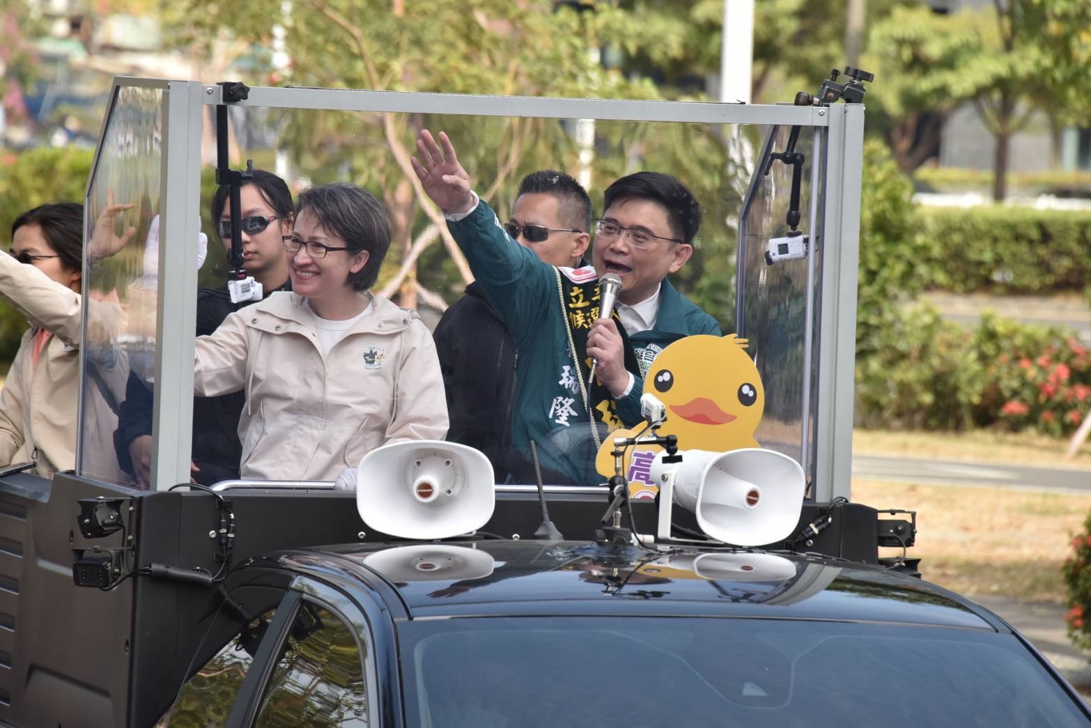 (記者李麗華報導)選戰倒數黃金48小時!今(11)日上午,民進黨副總統候選人蕭美琴陪同立委候選人賴瑞隆車隊掃街,呼籲鄉親1月13日出門投票,三張選票挺台灣。賴瑞隆也黃色小鴨公仔及88條黃色小鴨黃絲帶給蕭美琴,期盼八席全上國會過半,2024高雄更好台灣更好。