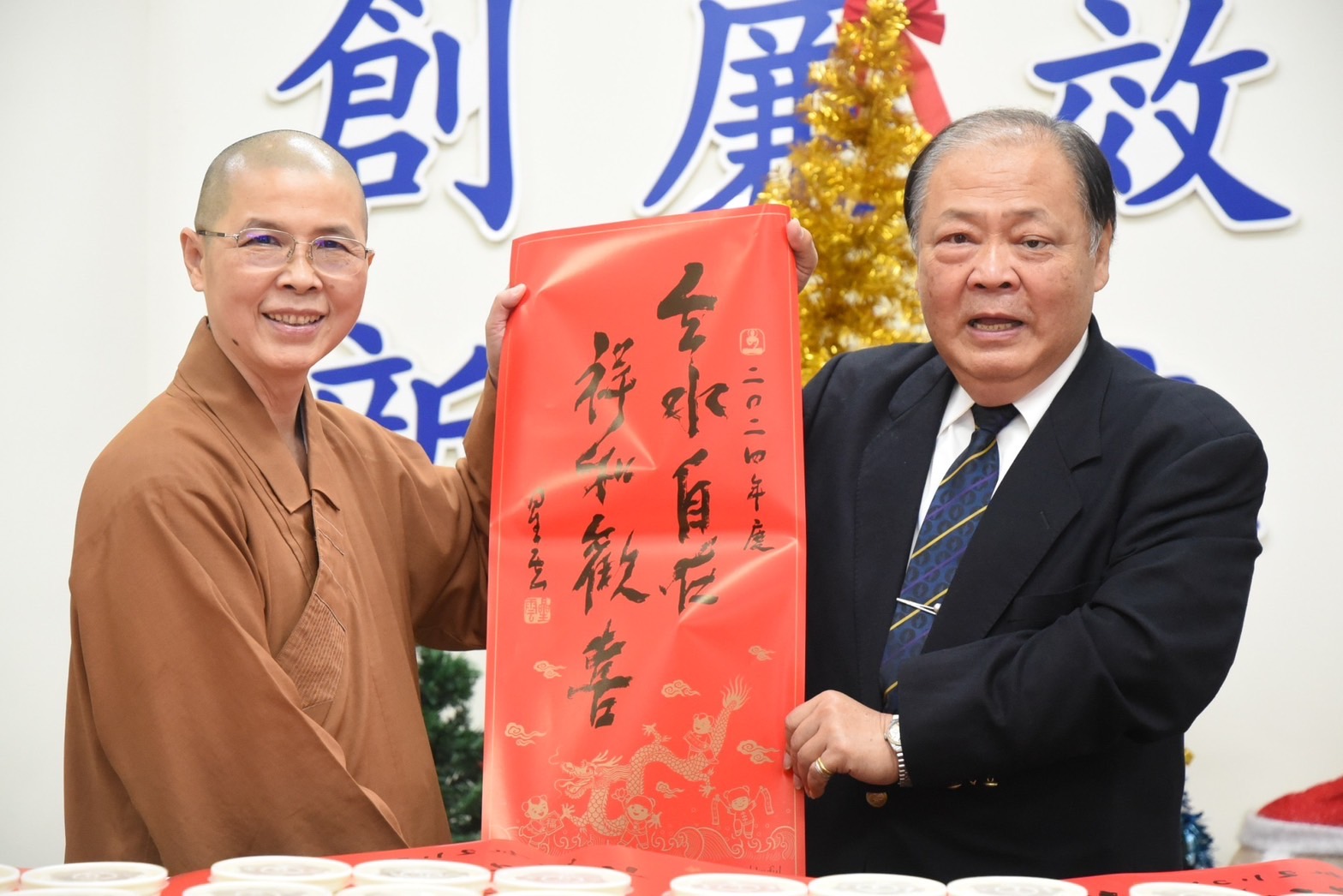 【記者李麗華/澎湖報導】佛光山海天佛剎15日致贈澎湖縣政府640份臘八粥及星雲大師2024年春聯墨寶「雲水自在,祥和歡喜」,縣長陳光復感謝海天佛剎傳遞慈善的力量及帶動社會祥和安康。他期盼社會大眾都能以無量的歡喜心,締結善緣,並祈願縣民朋友健康幸福。
