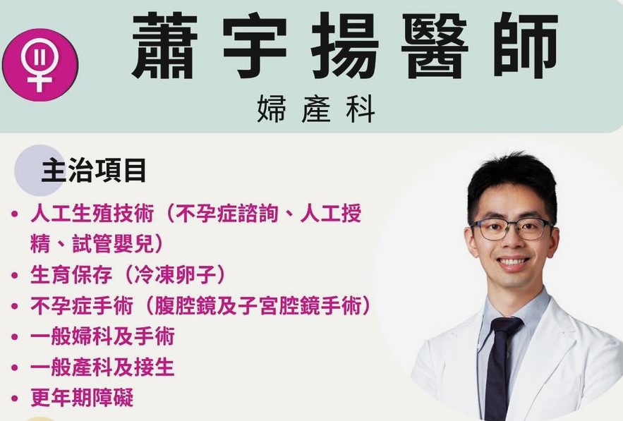 【記者黃山高/高雄報導】旗山醫院婦產科醫師蕭宇揚熱心服務,主治人工生殖技術包括不孕症諮詢、人工授精、試管嬰兒,生育保存(冷凍卵子),不孕症手術包括腹腔鏡及子宮腔鏡手術,一般婦科及手術,一般產科及接生,更年期障礙。