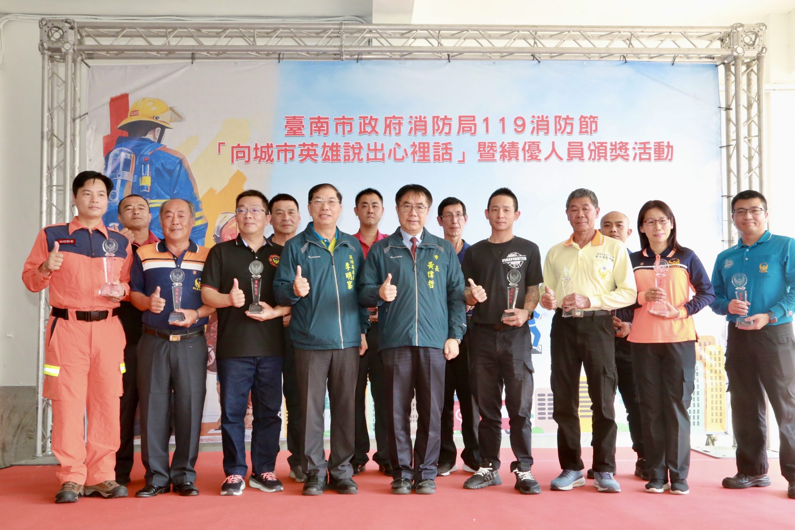 台南市政府今日辦理119消防節「向城市英雄說出心裡話」暨績優消防人員頒獎活動。(台南市政府提供)