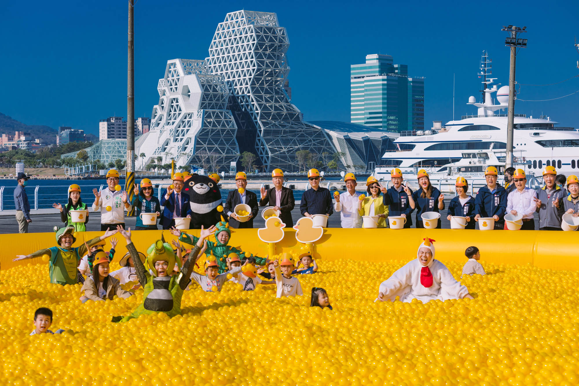 10年前黃色小鴨游進高雄,睽違10年重返回歸,城市街角隨處可見小鴨超萌身影,再度刮起一股黃色旋風,而在市府與臺灣港務公司通力合作下,高雄港16-18號碼頭將成為「冬日遊樂園」場域,陳其邁市長與臺灣港務股份有限公司董事長李賢義,在記者會上攜手宣布「市港合作」象徵締造港灣城市進步的「雙贏」,隨後到遊樂園的黃色球池舉行儀式,希望帶給市民及遊客加倍的療癒感與幸福感。