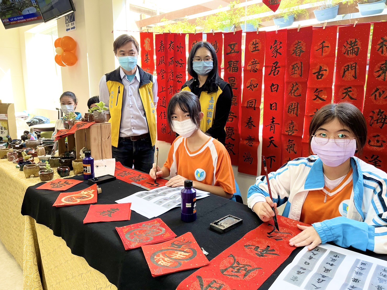 學生們在現場揮毫,展現深厚的書法功力,剛開始面對群眾雖然有些許的羞澀與靦腆,卻也都卯足勁發揮所學,以親手書寫的春聯,吸引眾多民眾前來購買,同時也送給年老就診者春聯,藉此傳遞對弱勢族群的關懷與對社會的奉獻。