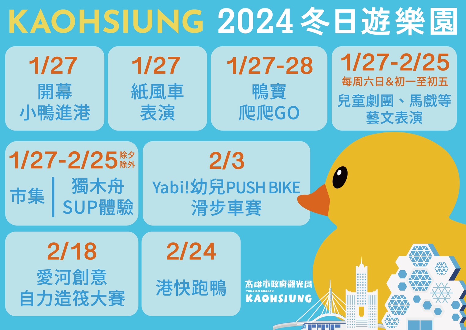 市長陳其邁表示,黃色小鴨將於1月27日重磅回歸,今年特別邀來2隻黃色小鴨,希望帶給市民雙倍的歡樂與療癒;同時,今年市府也特別和臺灣港務公司合作,讓新開放的16-18號碼頭化身為療癒的大型氣模藝術品展場,以及大型氣墊、球池、旋轉木馬、小火車等遊樂設施和美味餐飲市集的碼頭樂園;除餐飲市集外,所有設施及表演皆為免費。為迎接黃色小鴨到來,市府各局處同步辦理多項活動,包括鴨寶爬爬GO寶寶爬行趣味遊戲、港快跑鴨、愛河創意自力造筏、SUP、獨木舟體驗、Yabi!幼兒PUSH BIKE滑步車賽、兒童劇團、馬戲等藝文表演等,周周都有精彩活動,絕對讓大家意猶未盡。