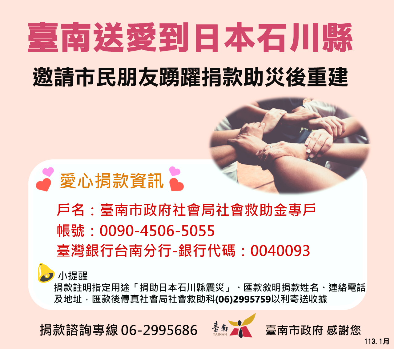 此次捐款專戶「臺南市政府社會局社會救助金專戶」、帳號:0090-4506-5055,捐款銀行:臺灣銀行台南分行。社會局提醒捐款人匯款時請指定「捐助日本石川縣震災」並註明捐款人姓名、電話及地址等資訊,俾利寄發收據。完成匯款後,請將匯款單傳真至臺南市政府社會局社會救助科,邀請市民踴躍捐輸善款,共同為幫助石川地區災後重建盡一份心力,捐款專線請洽06-2995686。