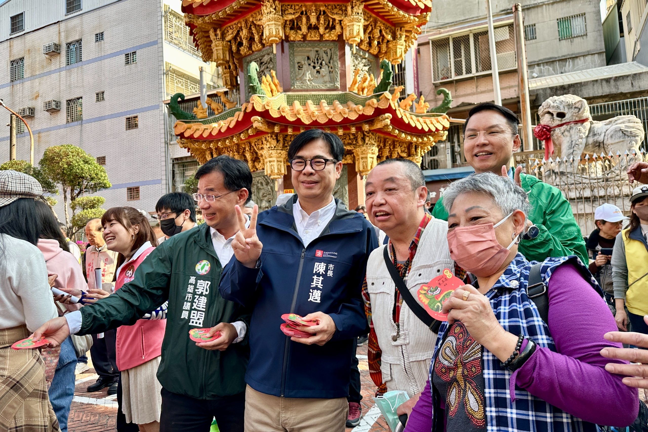 高雄市長陳其邁前往各地廟宇祈福,同時參與商圈過好年活動。(記者翻攝)