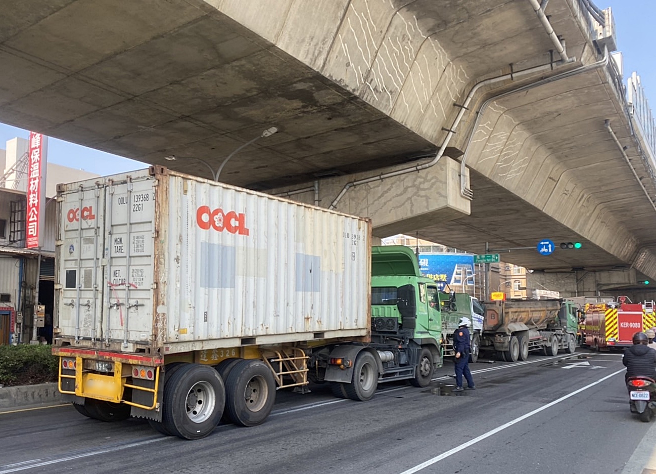 【記者張淑慧/高雄報導】113年1月29日10時,鳳山區南華一路、鳳甲一街(台88快速道路下方,往鳳山)路口有三部大車追撞造成交通事故,經員警到場了解為最前方砂石車駕駛嘪男(35歲)於上址停等紅燈,後方龔男(57歲)駕駛大貨車停於後方,後方第三輛由林男(60歲)駕駛的貨櫃車疑未注意前車狀況,先追撞中間龔男之大貨車後,再由大貨車推撞最前方砂石車,致龔男手部輕微擦挫傷(不需送醫)、林男小腿輕微擦傷(送杏和醫院)。