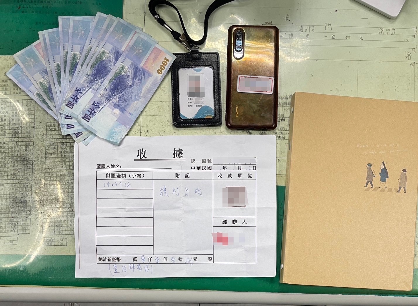 警方在二人身上查扣現金新台幣1萬元、偽造工作證及取款收據等證物。(高雄市鼓山警分局提供)