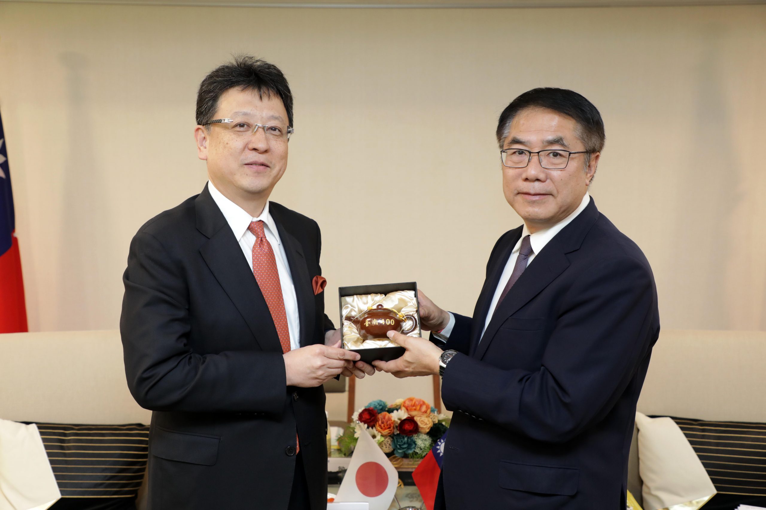 此外,今年是台南400年,黃市長特別準備台南四百紀念茶壺與燈會限定茶葉禮盒致贈給大西市長,並介紹2024台灣燈會及國際蘭展等活動,歡迎訪賓再度來訪。