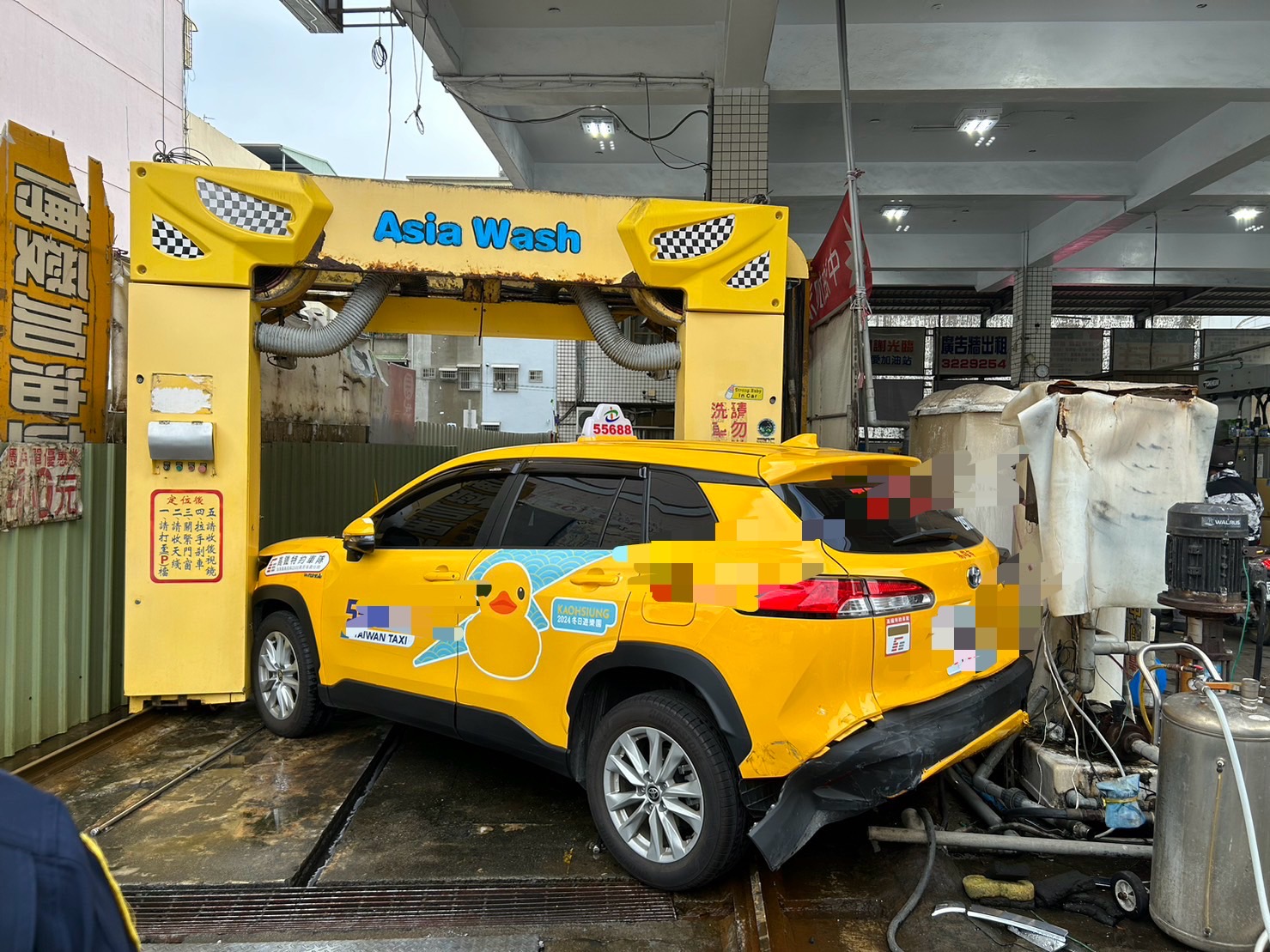 老翁駕車準備進入機械洗車車道,卻撞上也是準備洗車的計程車。(記者翻攝)
