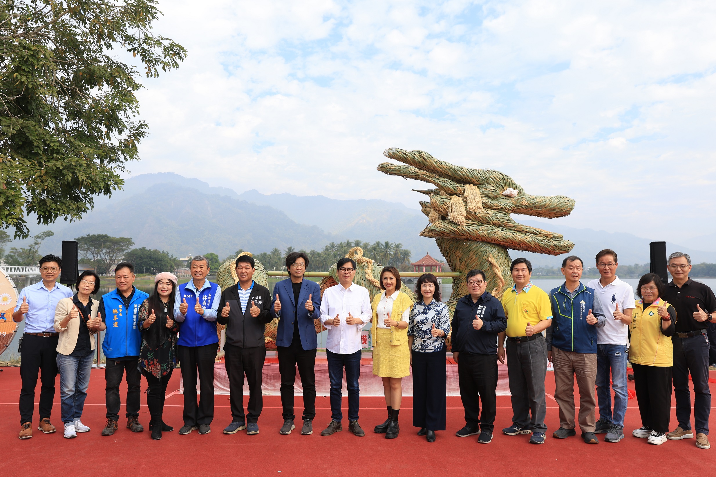 開園活動上,陳其邁及與會貴賓共同為湖畔裝置藝術「水蓮龍」進行揭幕,之後至花田區拍照。