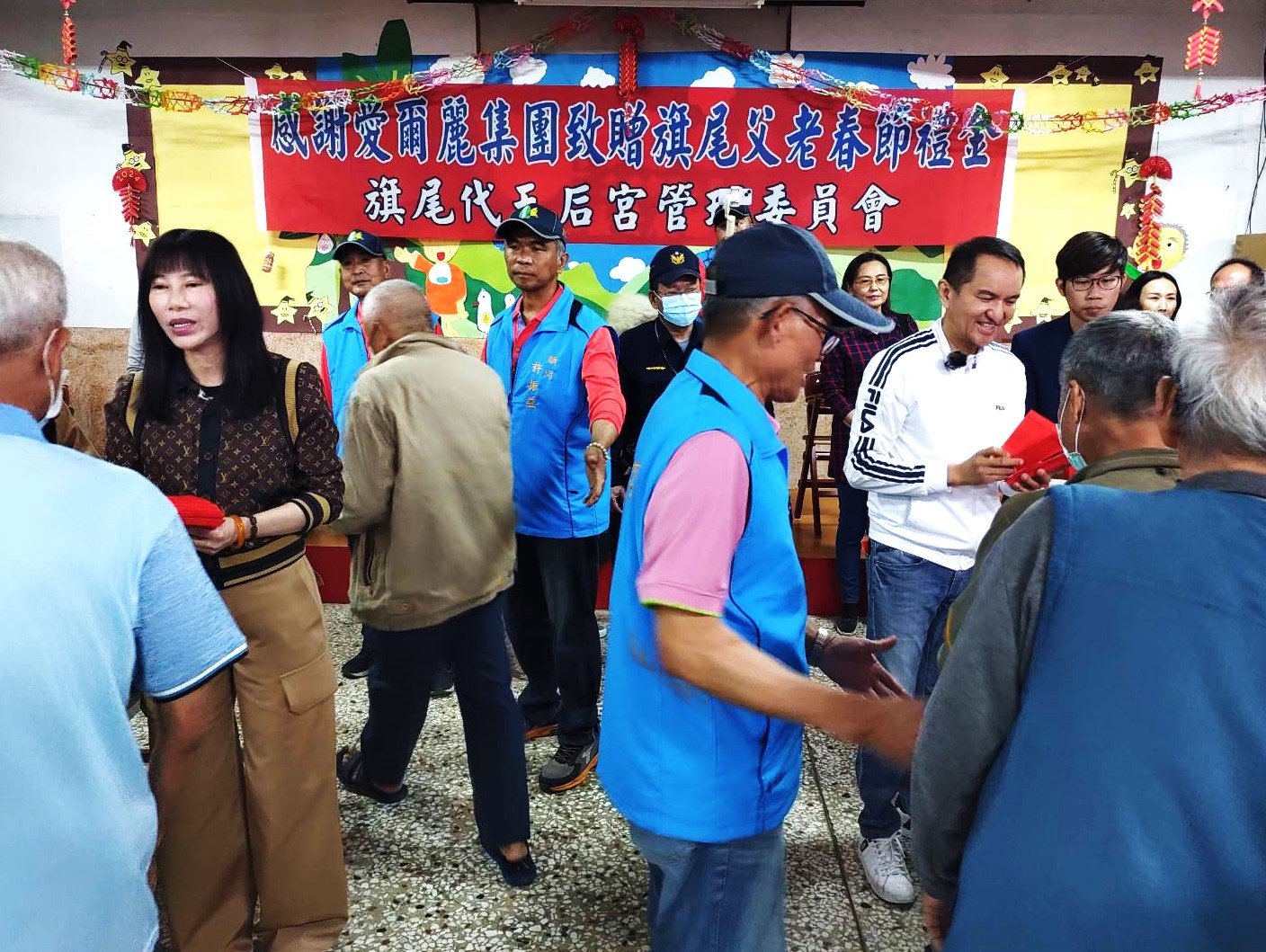 【記者黃山高/高雄報導】愛爾麗國際醫療集團常如山總裁及劉貞華總經理5日於旗山區旗尾代天后宮辭歲賀年活動中,發送旗尾地區八百多位年滿65歲以上老人新春敬老紅包每人二千元,此公益活動今年已第九年,累計發送敬老紅包總金額逾千萬元,常總裁強調積德不積財,秉持父親「有成就時就要對國家社會付出」訓示,與劉總經理以「回饋無所求」之心行善為其終身志業。