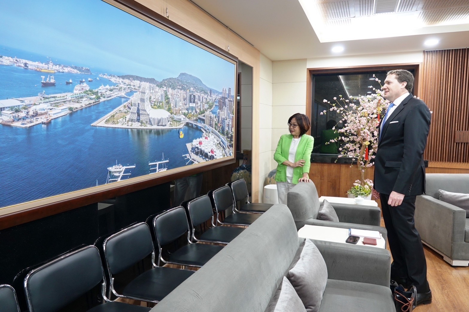 去年8月上任、講著一口流利台語的張子霖處長,一見面便祝福新年快樂,龍年行大運,讓康議長感到驚喜和佩服;高雄的變化之大,張處長則被議長會客室懸掛兩張相隔25年拍攝高流中心的碼頭照片驚豔。