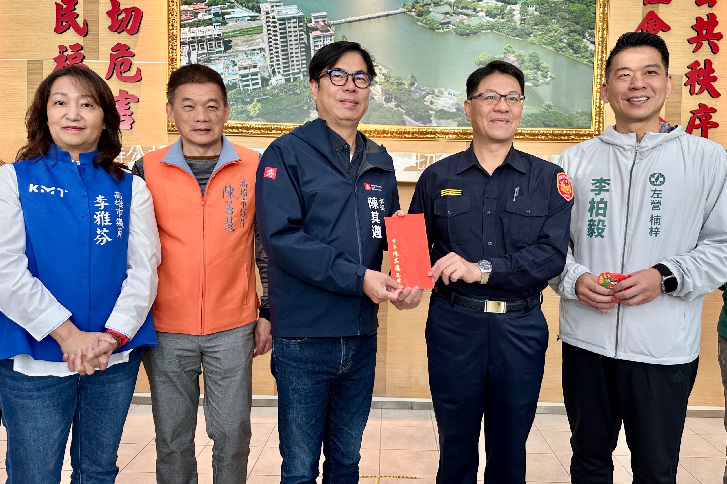 陳其邁特別準備水果禮盒和加菜金,並一一慰勉值勤員警辛勞,發送開運小紅包,為眾人加油打氣、提振士氣,感謝大家春節假期堅守崗位。