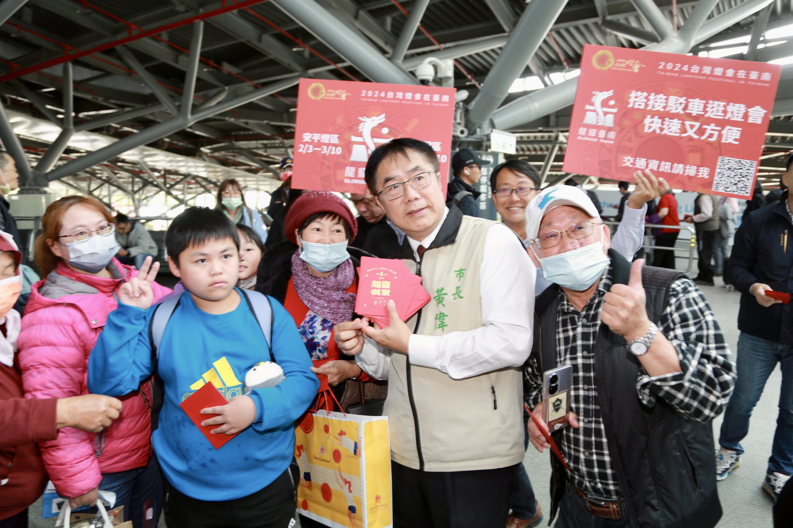 台南市長黃偉哲大年初一驚喜現身高鐵台南站剪票口,發送龍年紅包祝福返鄉遊子「龍喜利來」。(記者翻攝)