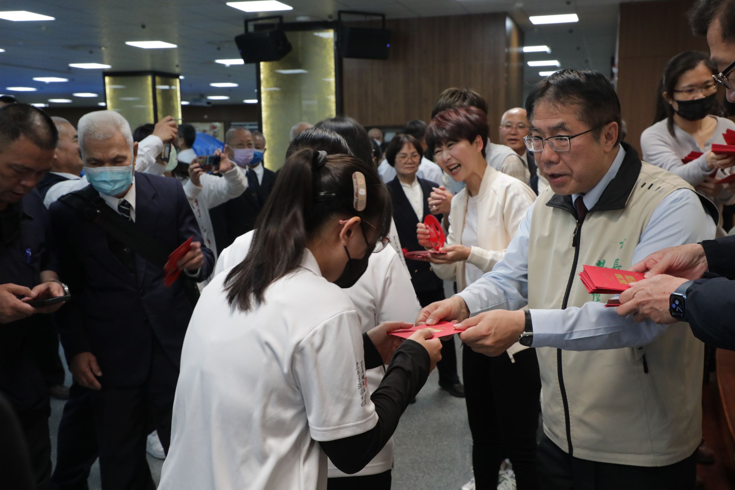 台南市長黃偉哲持續拜廟祈福行程,於上午前往南化區寶光聖堂參拜、發放春節紅包。(記者翻攝)