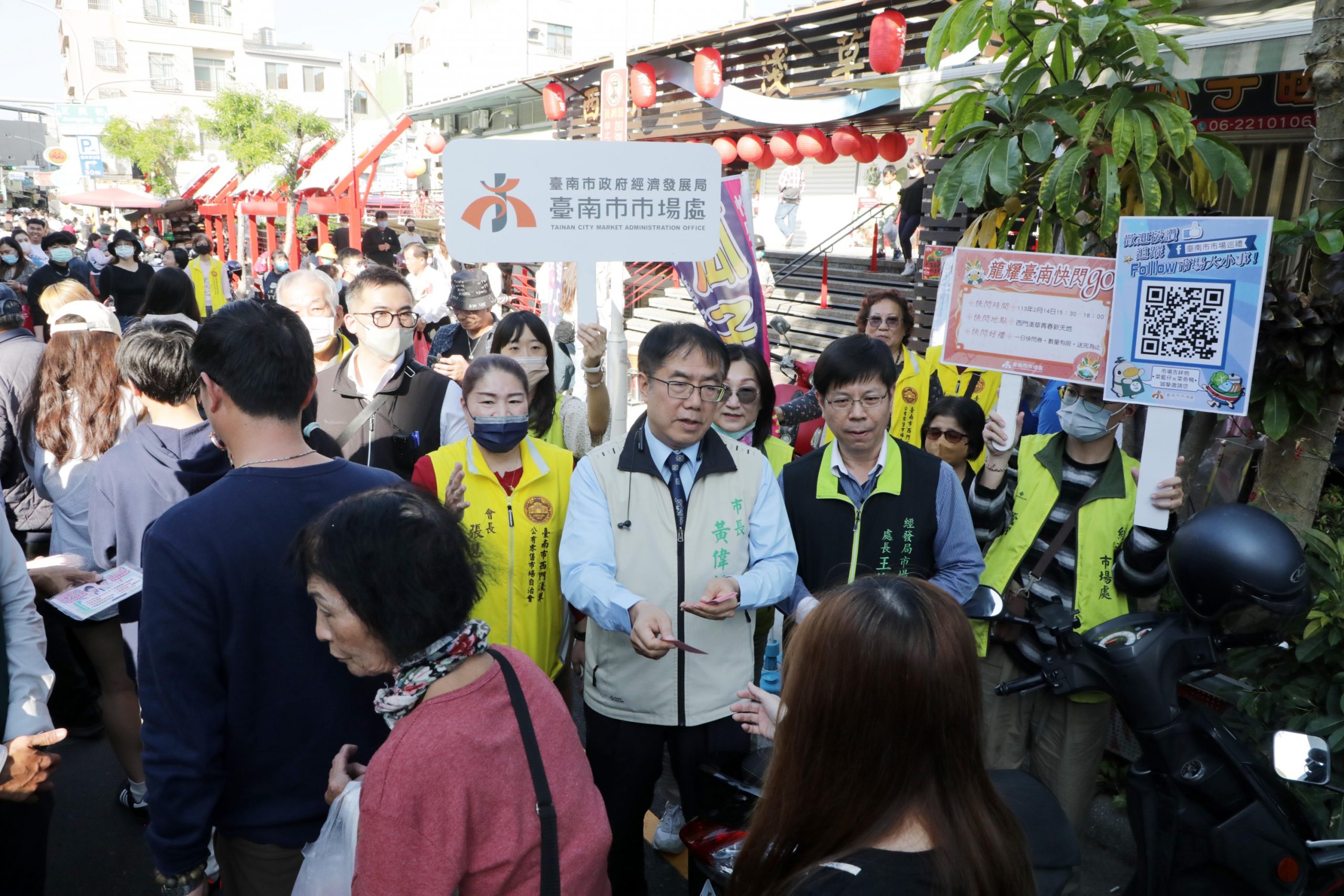 適逢農曆新年假期,「西門淺草青春新天地」也迎來觀光人潮高峰,臺南市長黃偉哲今(14)日前往淺草新天地發放50元銅板快閃券,讓現場遊客驚喜萬分。黃偉哲表示,希望透過快閃券的活動,讓民眾了解老市集的魅力,吸引更多遊客來西門淺草新天地採買,市議員沈震東也到場共襄盛舉。