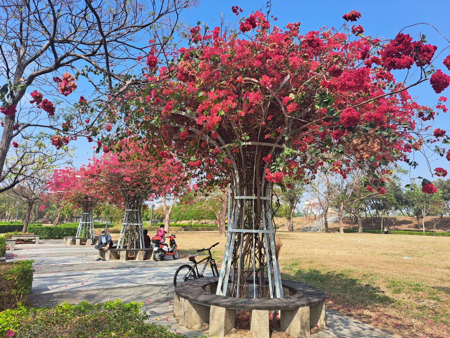 工務局表示,高雄市政府近十年來於道路、公園等地栽植多年生木本開花植物,隨著不同時序綻放各形各色的花卉,為城市上妝嬌豔。九重葛為紫茉莉科的常綠攀緣灌木,於每年11月至翌年4月綻放的豔麗苞片,花色從深紫、桃紅到淺粉,從杏橘、淡黃到純白,花型又有重瓣、單瓣、單色、雙色、漸層的變化。