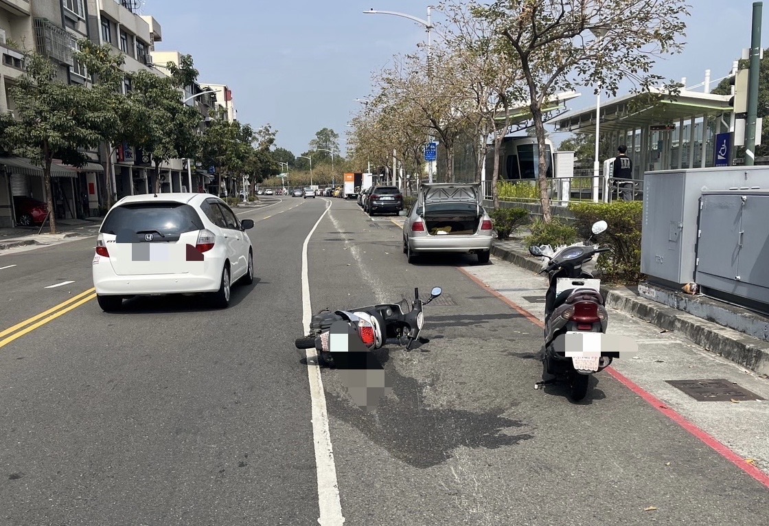 本分局於113年2月25日12時37分許接獲通報車禍,需要警方協助,警方遂派員到場。經瞭解係黃男(45年次)、陳女(62年次)各自騎乘重機車沿凱旋三路南向北慢車道行駛,於上述案發時、地,黃男附載之整把掃把掉落地面,陳女前輪壓到掃把而往右倒地摔出致肇事。黃男未受傷、陳女雙手擦傷,自行就醫;無人酒駕。