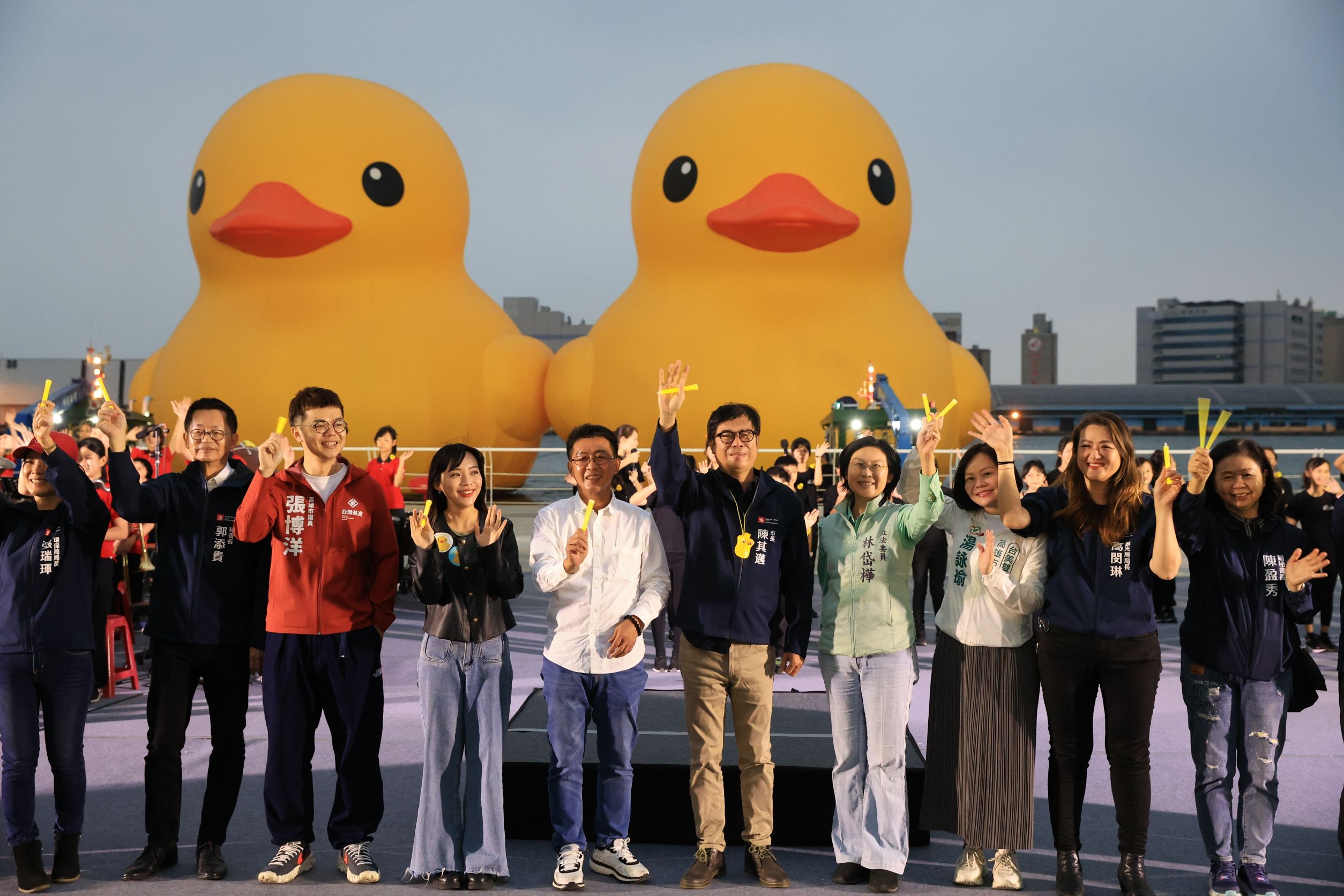 迎接「2024冬日遊樂園」展期最後一天,為感謝兩隻黃色小鴨為高雄帶來的幸福與歡樂,高雄市長陳其邁今(25)日下午率領市府團隊出席黃色小鴨歡送趴,活動現場邀請新古典室內樂團、中正國小管樂班及福山國小合唱團等團隊,為兩隻小鴨送上了多元溫暖的樂音,伴隨著雙鴨合體離港。