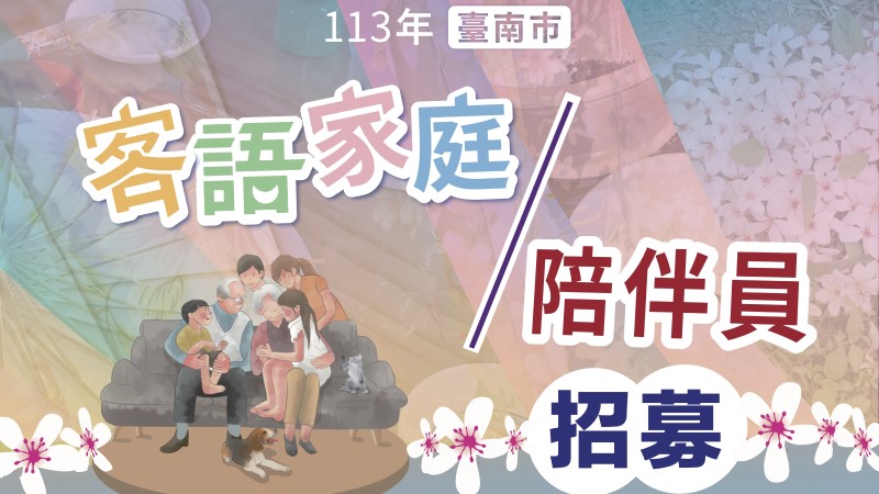 家庭一直都是孕育母語重要的搖籃,為鼓勵市民說客語,臺南市政府將招募「客語家庭陪伴員」並徵集30個「客語生活家庭」。陪伴員扮演「居家服務」角色,媒合後進入客語生活家庭,透過互動、聊天、陪伴,讓講客語變得自然而然。客語家庭陪伴員自即日起開始報名,甄選訂於113年3月30日(六),甄選通過須接受36小時專業培訓,後續陪伴員進入家庭還可領取陪伴鐘點費。