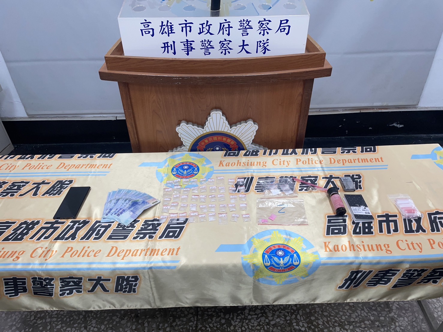 第二級毒品安非他命45包(30公克)、第三級毒品一粒眠2包(2公克)、第三級毒品愷他命3包(3公克)、新臺幣13900元、電子磅秤1臺、夾鏈袋1包、毒品吸食器1組、手機2支等證物。(高雄市政府警察局刑事警察大隊提供)
