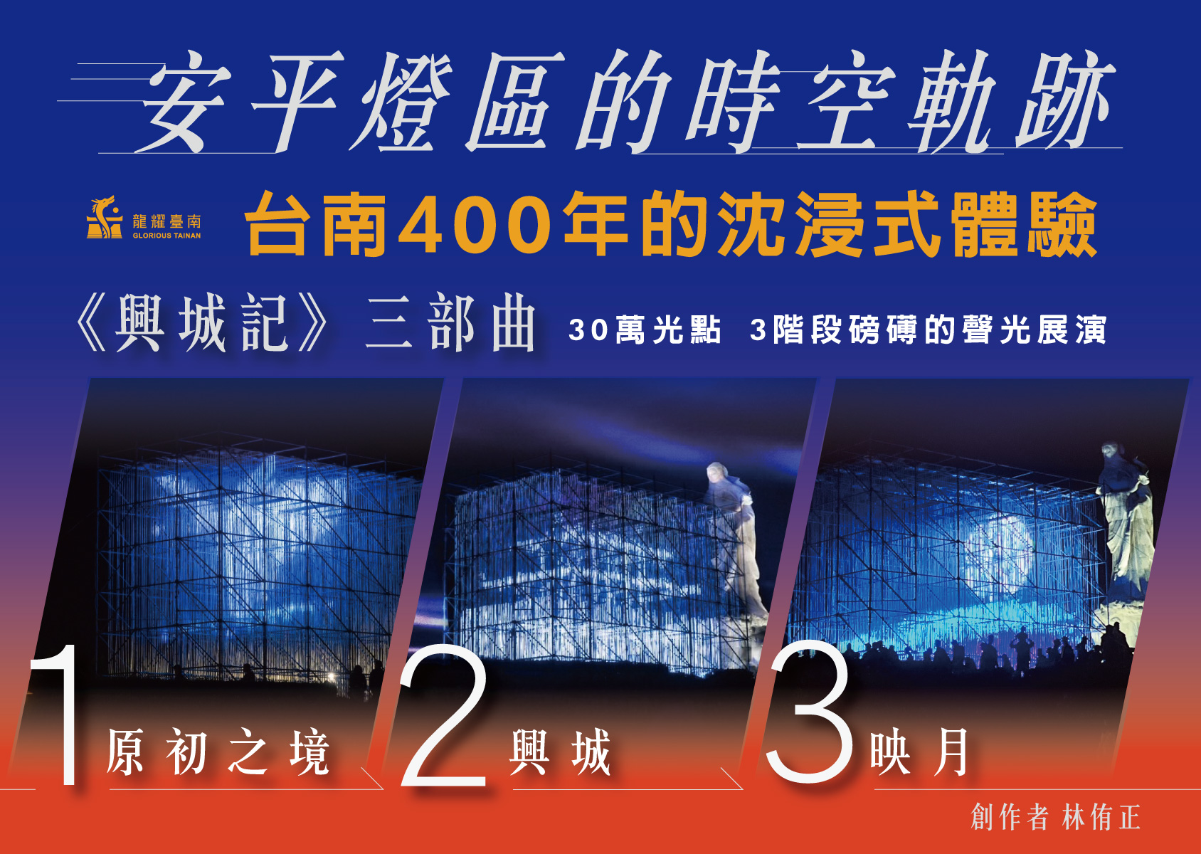 市府文化局說明,「興城記」可分為「遠觀城」、「近沐光」兩大部份,前者使用互動光雕方式,透過三部曲,呈現臺南400年的沈浸式體驗;後者則邀請民眾可走進作品內,透過聲音與光影作品的互動,體驗觸動30萬個光點變化的即時感受。「興城記」每15分鐘展演一次,民眾只要於展演後的小彩蛋影片中,找出「臺南400 logo」拍下,上傳於個人「FB、IG、Threads、Twitter」等公開平台,寫上關鍵字「#2024台灣燈會在台南-安平燈區」,即可至大會i2服務台領取限量小禮物。