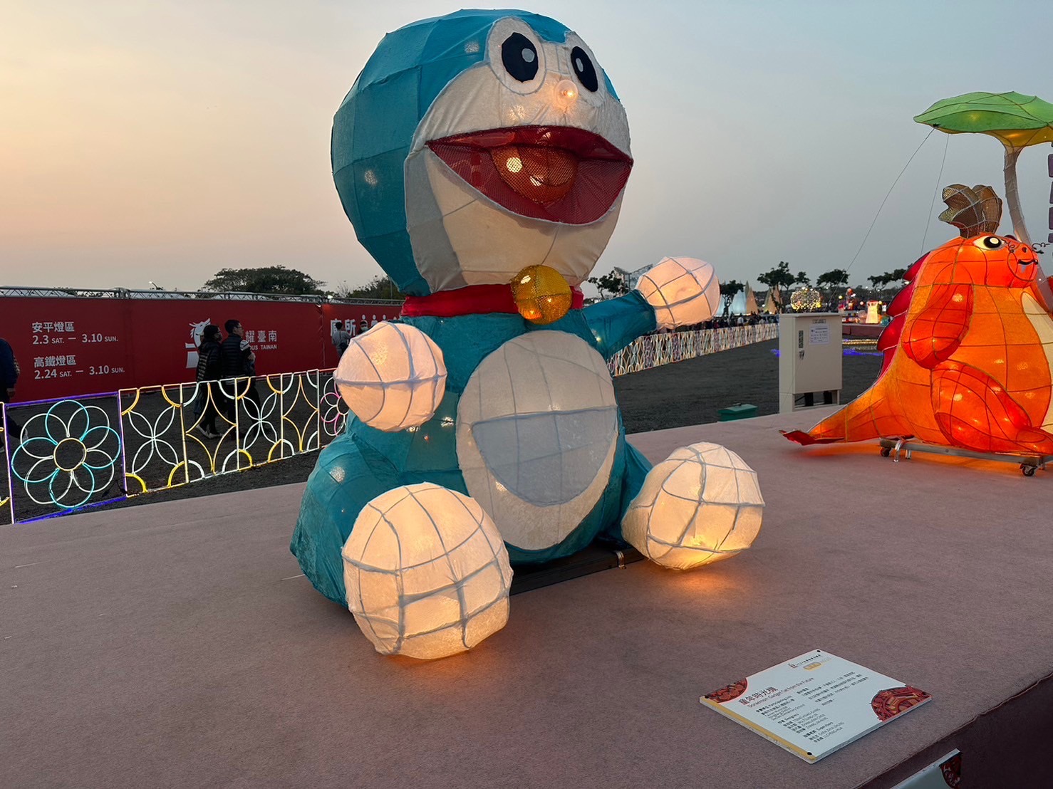 觀旅局林國華局長表示,競賽燈區除了各組冠軍的燈王深受矚目外,開展前就爆紅的「台灣奇案-陳守娘」也吸引許多民眾前往參觀,觀旅局並推出每周六、日晚上7至8時,由專業導覽老師介紹陳守娘故事的解說活動,讓大家賞燈之餘也認識這位台南奇女子。而近日燈區內親子組亦有哆啦A夢作品「童年時光機」的造型引發社群網友熱議,也湧入許多網友對學校師生等作者表達鼓勵與加油之意,黃偉哲市長也親上網路平台留言為創作的師生打氣,並歡迎大家來臺南賞燈,欣賞孩子們發揮想像力、創造的精彩作品。林局長說「哆啦A夢」擁有任意門與百寶袋,是大家日常生活中也最想要擁有的超強工具,為了感謝大家對2024台灣燈會的支持,讓整體燈會參觀人次於3月2日突破千萬,在活動最後一週的週一到週四,也就是3月4日至3月7日,只要到高鐵燈區找到競賽燈區親子組的「哆啦A夢」作品,並拍照打卡上傳自己的臉書或IG等社群平台,即可至燈區旁的i6服務台兌換限量「燈會百寶袋」與「主燈觀禮台任意門」各一份,每天限量50組,送完為止。