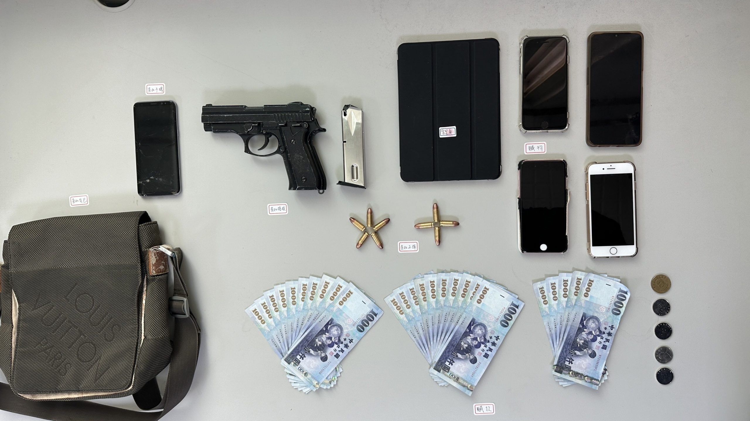 【記者林偉呈/高雄報導】鼓山分局內惟派出所於113年3月11日21時52分許,接獲在高雄市鼓山區青海路有一起搶案,警方速抵現場,報案人稱渠車輛、現金6、7萬及手機四支遭搶,警方組成專案小組,調閱監視器及運用科技偵查,火速於5小時逮捕涉嫌人,並查扣改造手槍一把及子彈9顆、新台幣25,090元、手機5支(含嫌犯自有1支)、平板1部、做案用背包1個,本案依強盜、槍砲彈藥管制條例罪嫌,移送高雄地檢署偵辦並建請羈押。