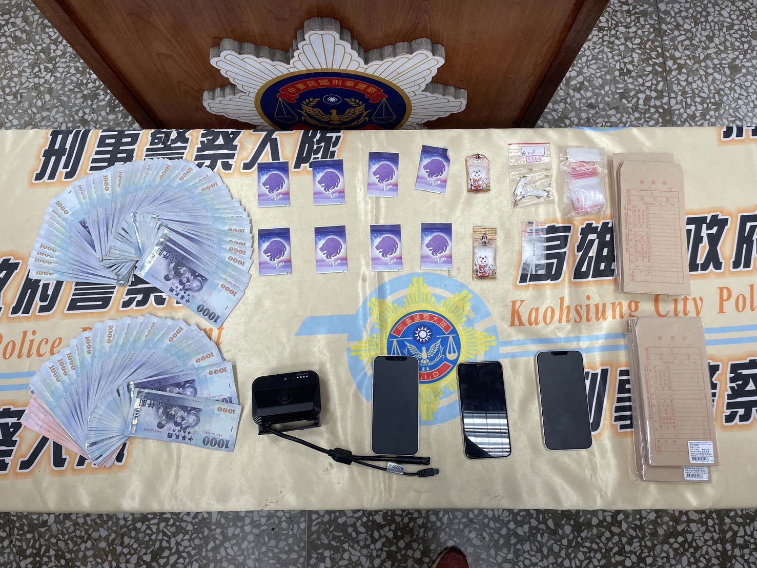 毒品咖啡包8包(毛重約40公克)、毒品愷他命3包(12公克)、手機3支、贓款新臺幣16萬9仟元等證物。(高雄市政府警察局刑事警察大隊提供)