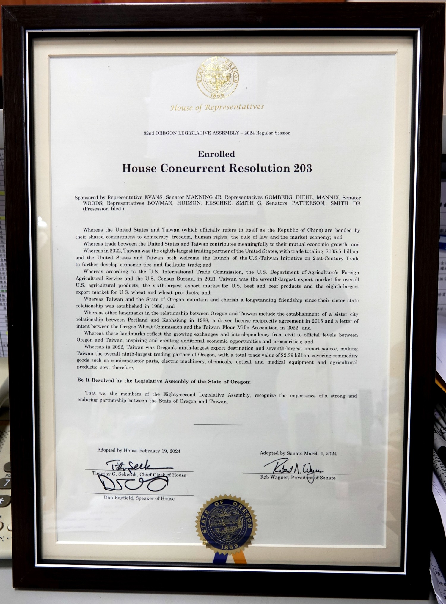 保羅‧伊凡斯(Paul Evans)州眾議員積極推動奧勒岡州史上首份友台決議文HCR203,於今年初先後獲得參眾議會同意通過,為雙方關係寫下重要里程碑。他特地親送決議文來高雄,並表示:「每次訪問高雄就像回家一樣!」,他也期望在HCR203友台決議文的基礎上,敦促恢復設立奧勒岡州駐台貿易辦事處,並實際深化彼此關係與各項合作。