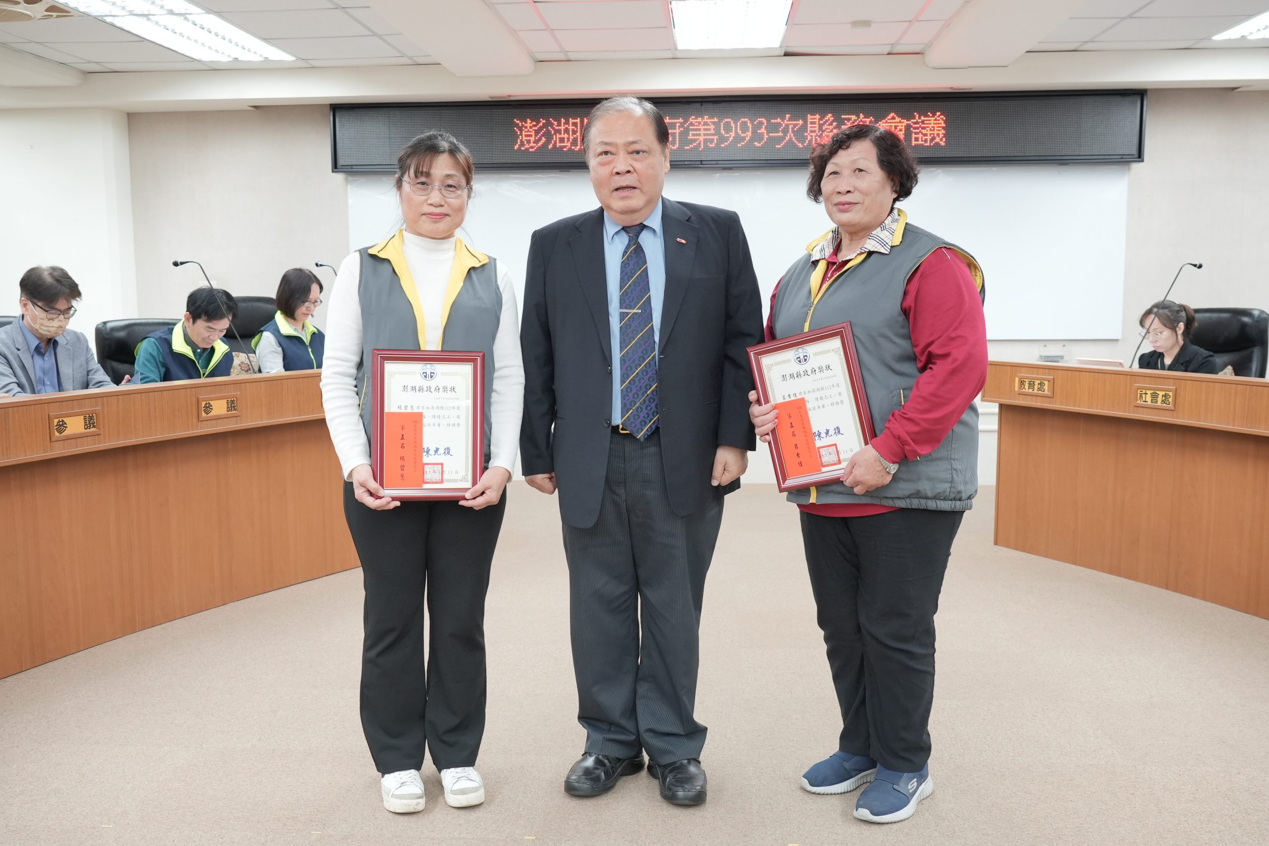 (記者林芸報導)澎湖縣長陳光復今(15)日上午主持縣府第993次縣務會議,於會中頒獎表揚優秀人員,肯定其在自身領域的優秀表現,同時歡迎社會處長周柏雅今日履新,並對處長寄與厚望,期許其以豐富的專業知識和經驗,為縣民福祉努力。